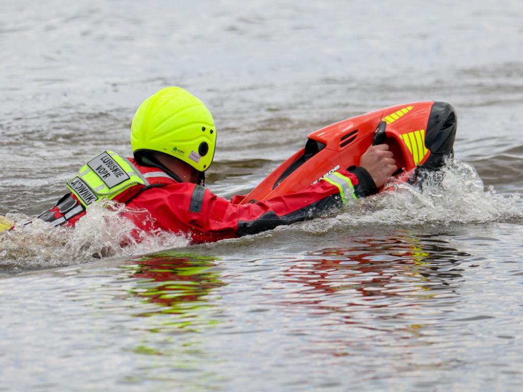 Prowadzący szkolenie w szczególny sposób skupili się na prawidłowym sprawdzeniu i przygotowaniu skutera wodnego do pracy. Przypomnieli, jak prawidłowo i bezpiecznie przemieszczać się na jednostce, manewrować w ograniczonej przestrzeni oraz prowadzić ją w ślizgu. Ważnym elementem było również podnoszenie umiejętności pracy na dużej fali oraz pracy zespołowej przy obsłudze skutera wodnego z platformą ratowniczą.