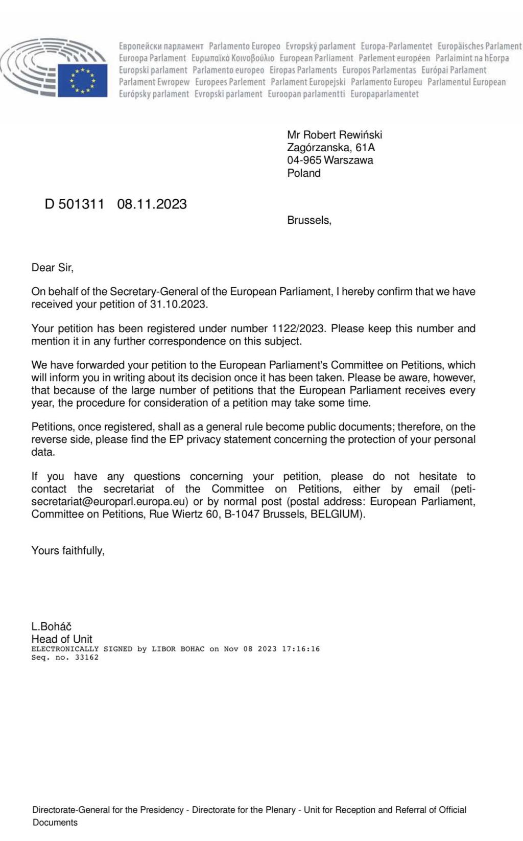 Petycję w tej sprawie złożyliśmy w Parlamencie Europejskim w Strasburgu 31 października 2023 roku. Treść w języku polskim i angielskim dołączamy do niniejszego tekstu.