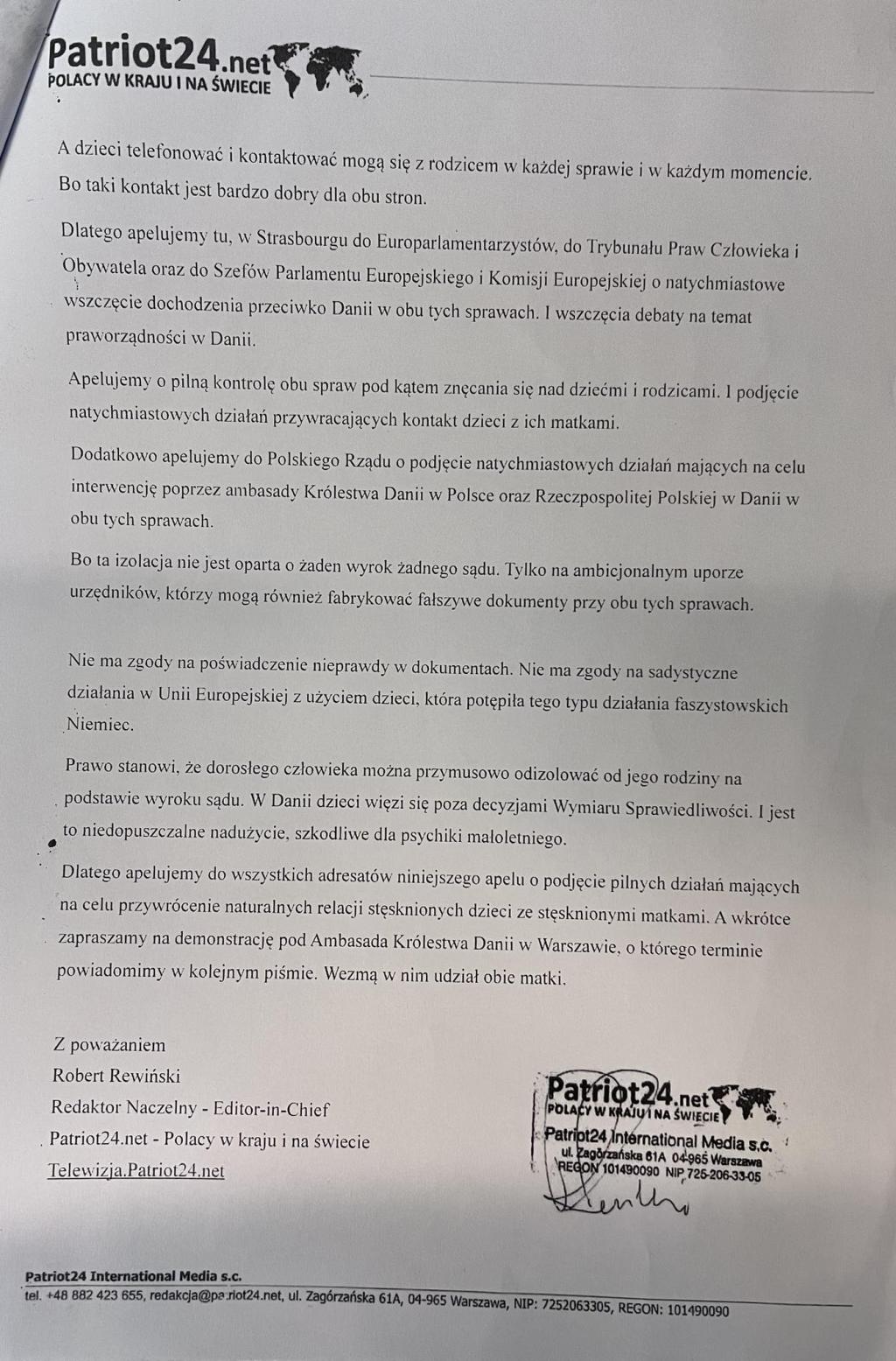 - Koszmarną normą jest wydawanie przez duńskich urzędników dokumentów, do których ci sami urzędnicy w ogóle się nie stosują. Kłamią, oszukują i zwodzą tylko po to, by bezdusznie zniszczyć więzy rodzinne pomiędzy dzieckiem a rodzicem - dodaje Robert Rewiński.